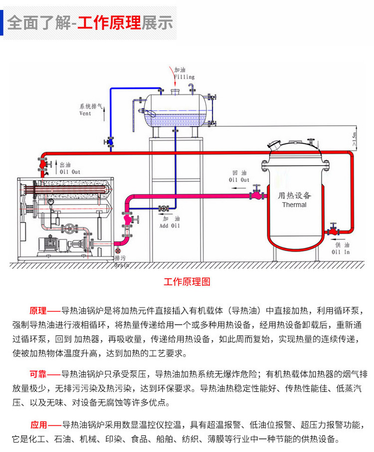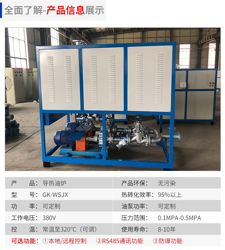為熱用戶輸出高320℃的熱油;電加熱導(dǎo)熱油爐設(shè)備投資少:由于導(dǎo)熱油加熱系統(tǒng)簡單,無水處理設(shè)備及更多的輔助設(shè)備、鍋爐承受低壓力等,所以整個(gè)系統(tǒng)投資較少.