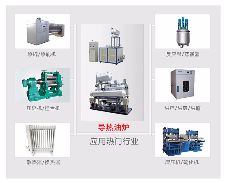 食品、化學(xué)工業(yè):聚合、縮合、蒸餾、熔融、脫水、強(qiáng)制保溫等;油脂工業(yè):脂肪酸蒸餾、油脂分解、濃縮、酯化、真空臭等反應(yīng)釜加熱、合成纖維工業(yè):聚合、熔融、紡絲、延伸、干燥等;紡織印染工作:熱定型輥筒加熱、烘房加熱、熱容染色等;非紡織工業(yè):無紡布等;飼料工業(yè):烘干等;塑料及橡膠工業(yè):熱壓、壓延、擠壓、硫化成型等。造紙工業(yè):干燥、波紋紙加工等。木材工業(yè):多合板、纖維板加壓成型、層壓板加熱、熱壓板加熱、油壓機(jī)控溫、木材干燥等。建材工業(yè):石膏板烘干、瀝青加熱、混凝土構(gòu)件保養(yǎng)等;機(jī)械工業(yè):噴漆、印花烘干等;