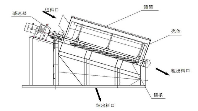 滾筒裝置傾斜安裝于機(jī)架上。電動(dòng)機(jī)經(jīng)減速機(jī)與滾筒裝置通過(guò)聯(lián)軸器連接在一起,驅(qū)動(dòng)滾筒裝置繞其軸線轉(zhuǎn)動(dòng)。當(dāng)物料進(jìn)入滾筒裝置后,由于滾筒裝置的傾斜與轉(zhuǎn)動(dòng),使篩面上的物料翻轉(zhuǎn)與滾動(dòng),使合格物料(篩下產(chǎn)品)經(jīng)滾筒后端底部的出料口排出,不合格的物料(篩上產(chǎn)品)經(jīng)滾筒尾部的排料口排出。由于物料在滾筒內(nèi)的翻轉(zhuǎn)、滾動(dòng),使卡在篩孔中的物料可被彈出,防止篩孔堵塞。滾筒篩砂機(jī)、滾筒篩分機(jī)與滾筒篩的原理構(gòu)造幾乎相同,是人們對(duì)它的認(rèn)識(shí)和叫法上存在差異。