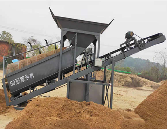 滾筒篩沙機是仿照人工利用斜面篩網(wǎng)篩砂的工作原理,采用平置滾篩筒,并保證料流在篩筒中的多圈內(nèi)螺旋葉片間可連續(xù)滾篩五圈以上,從而使砂料反復(fù)翻滾、滑動而充分離散、分離;滾筒式篩沙機不同于斜置滾篩引起的大小料相互推擠、埋壓,篩分過程匆忙;也不同于斜置滾篩或斜置振動篩所引起的大小料相互沖擠或大料托小料振跳而引起的篩分不干凈、混料現(xiàn)象。滾筒篩內(nèi)的打砂裝置,可對呈團砂塊打碎、打散。滾篩網(wǎng)面安裝的網(wǎng)面清理裝置可對粘附砂土自行清理以防堵塞網(wǎng)孔。