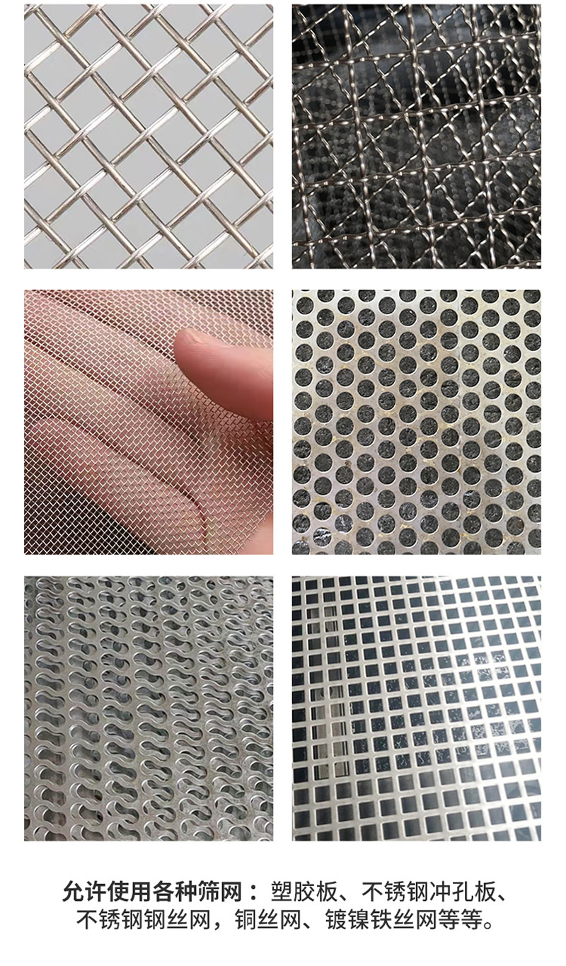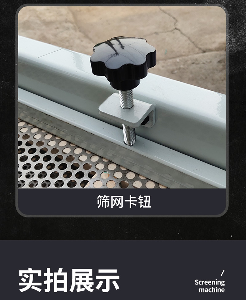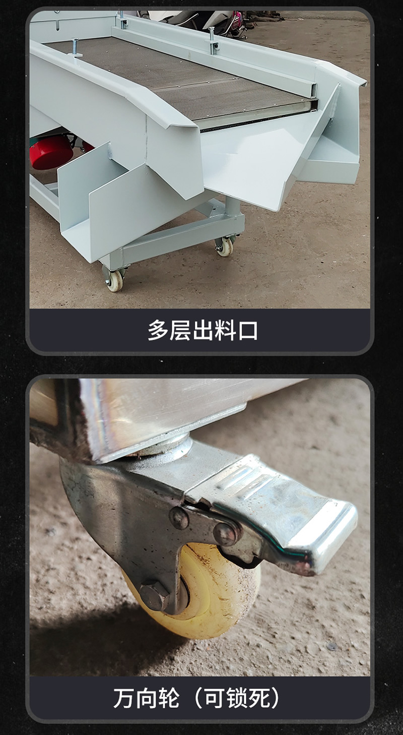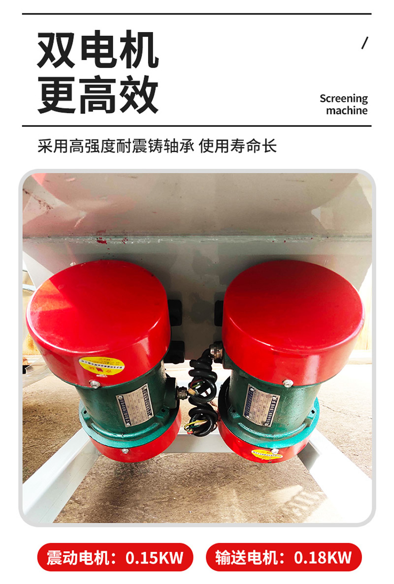 2、振動篩選機可選用220V-2.2kw或380V-1.5kw電機做動力源,集風(fēng)選和篩分為一體,能干凈徹底地清除糧食或油料種子里面的各種雜質(zhì)和塵土,振動分選機由料斗、機架、傳動機構(gòu)、風(fēng)機、風(fēng)道等五部分組成,機架地腳裝有四個輪子,方便移動;篩網(wǎng)與機架采用分體式結(jié)構(gòu),便于更換各種不同目數(shù)的網(wǎng)篩。