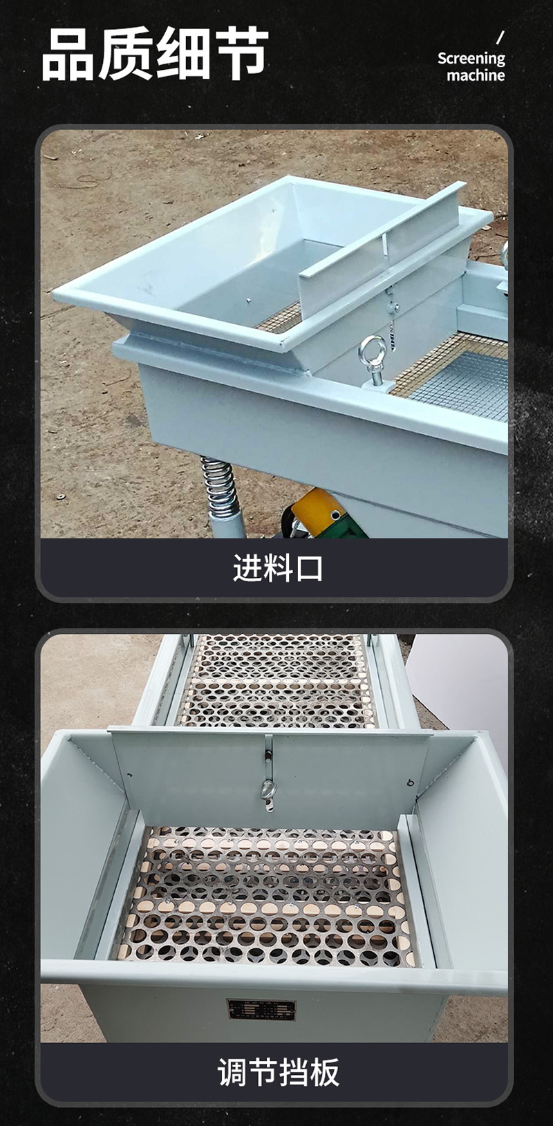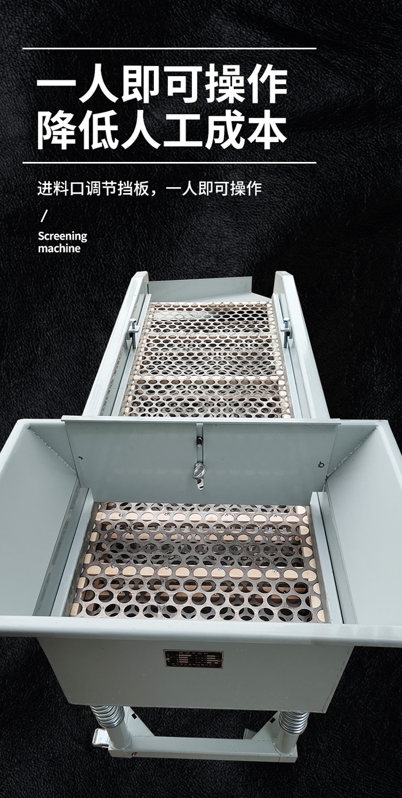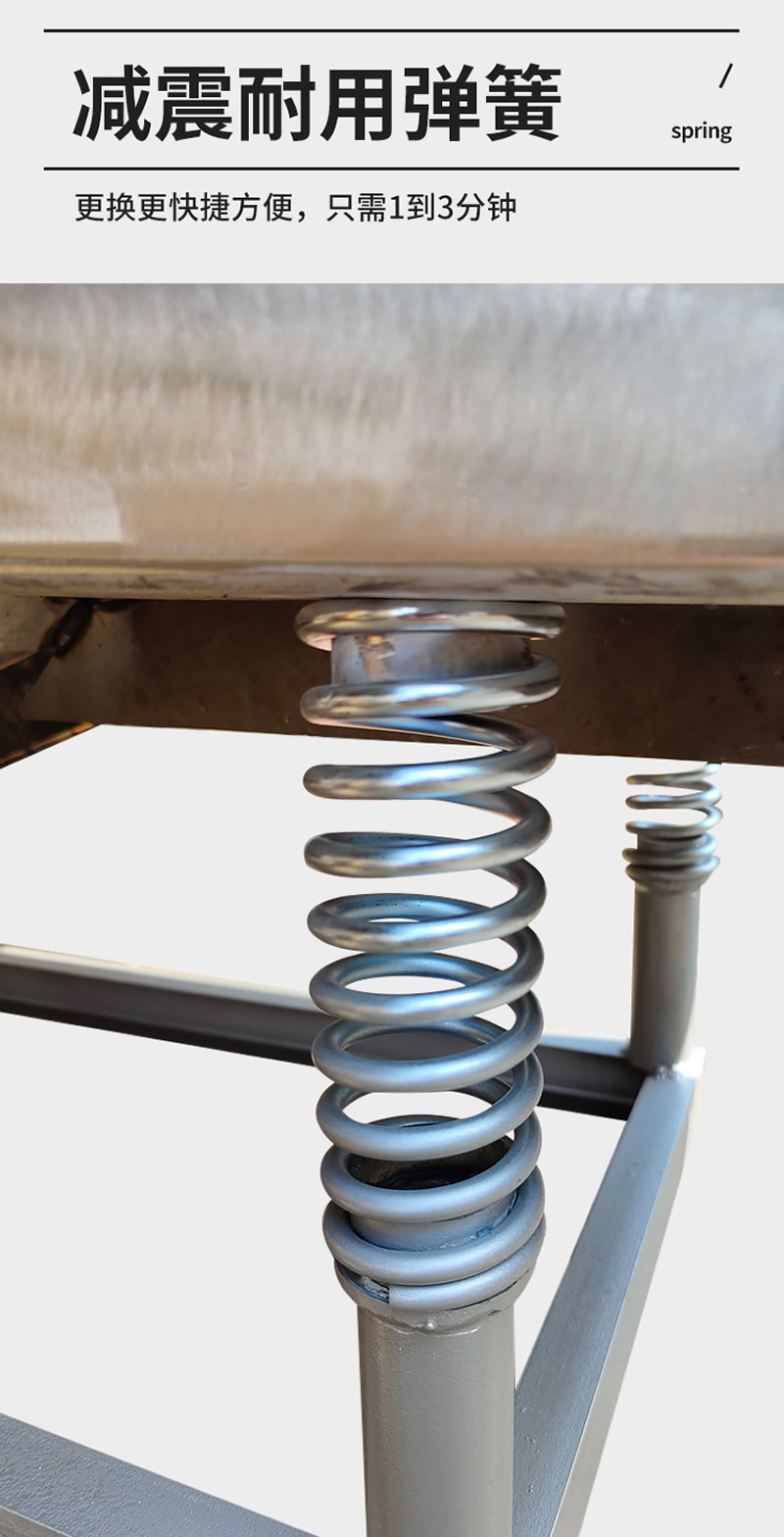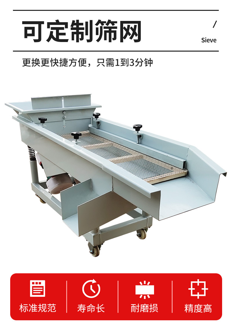 2、振動篩選機可選用220V-2.2kw或380V-1.5kw電機做動力源,集風(fēng)選和篩分為一體,能干凈徹底地清除糧食或油料種子里面的各種雜質(zhì)和塵土,振動分選機由料斗、機架、傳動機構(gòu)、風(fēng)機、風(fēng)道等五部分組成,機架地腳裝有四個輪子,方便移動;篩網(wǎng)與機架采用分體式結(jié)構(gòu),便于更換各種不同目數(shù)的網(wǎng)篩。
